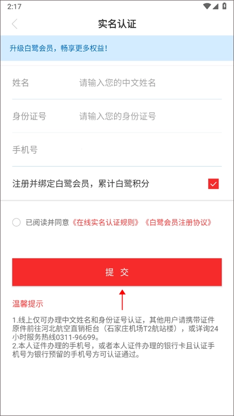 2、输入自己的姓名、身份证号、手机号,选择“注册并绑定白鹭会员,累计白鹭积分”,最后点击提交。