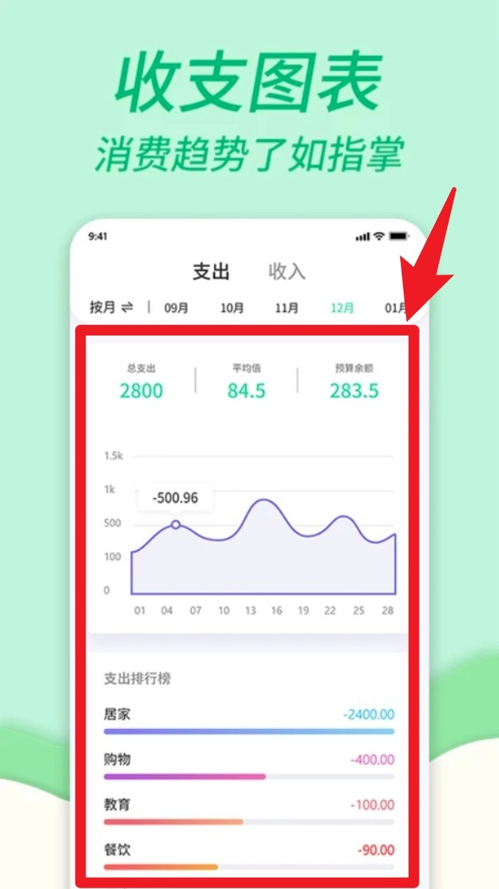 5. 在收支图表面中可查看月度消费趋势与分类排行,帮助用户分析财务状况,优化用钱结构,提升管理意识。