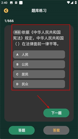3、在题目页面完成答题后,点击下一题按钮继续答题。