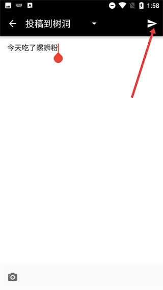 4、在选择【树洞】分类后,输入你想分享的内容,然后点击页面右上角的发送图标,这样就能完成投稿了。