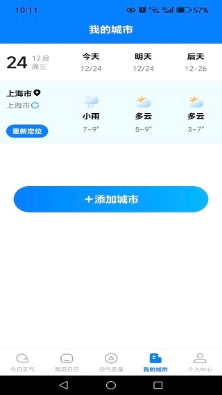 4、在我的城市页面,可以添加多个地方城市信息,便于关注更多地方气象结果。