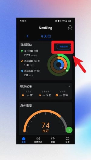 1、打开后进入首页,在日常活动区可查看今日步数、热量消耗与活动距离,点击右上角的调整目标按钮即可自定义每日目标。