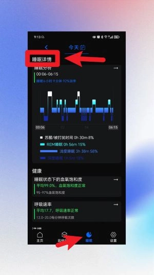 3、在睡眠评分页面向下滑动即可看到睡眠详情区块,其中包含整晚睡眠的阶段图表,颜色区分不同睡眠阶段,轻点项目还能进一步分析数据。