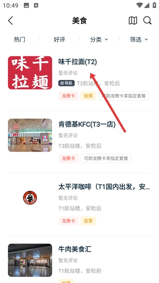 1、在首页找到并点击【美食】图标,即可进入机场美食列表页面,在该页面能够查看各类餐饮店铺的相关信息。