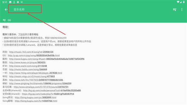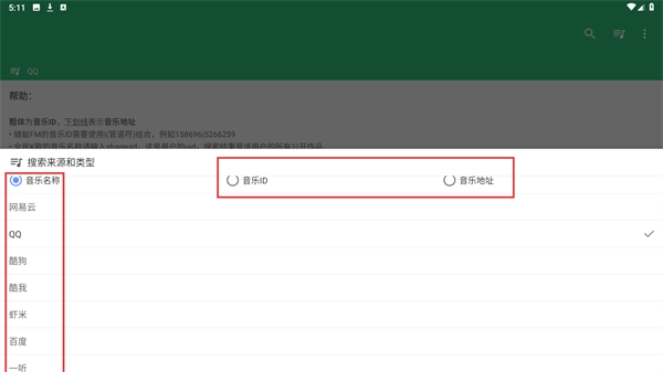 2、在展开的选项,选择【音乐ID】类型,同时从左侧列表选定对应平台,完成搜索来源的配置。
