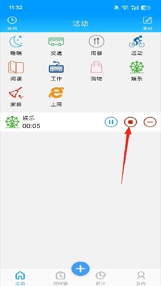 2.点击【娱乐】选项开始计时并点击图示按钮终止计时