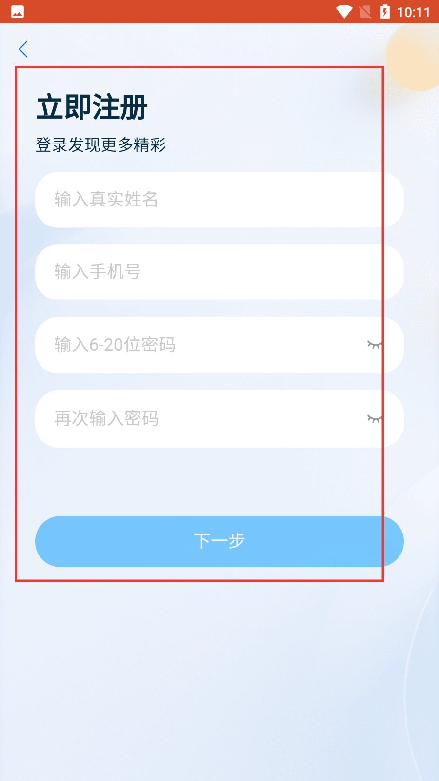 4、进入注册页面后,按顺序填写【真实姓名】等信息,再次确认密码无误后,点击【下一步】按钮,即可完成账号注册流程。