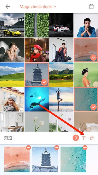2、进入照片选择界面,勾选需要使用的照片后,点击右下角“下一步”选项。
