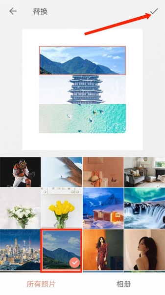 4、跳转至替换界面后,勾选用于替换的图片,点击右上角“打钩”图标,即可完成原图片删除。