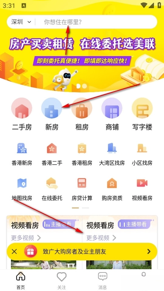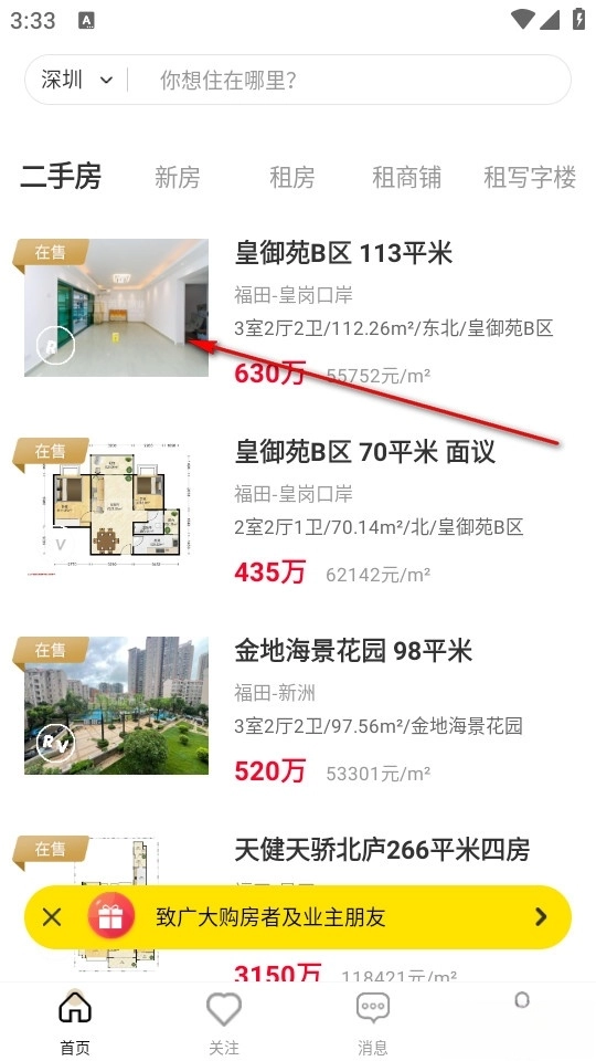 我们点击软件进入首页,我们能在软件中搜索到指定位置或商圈周边房屋。