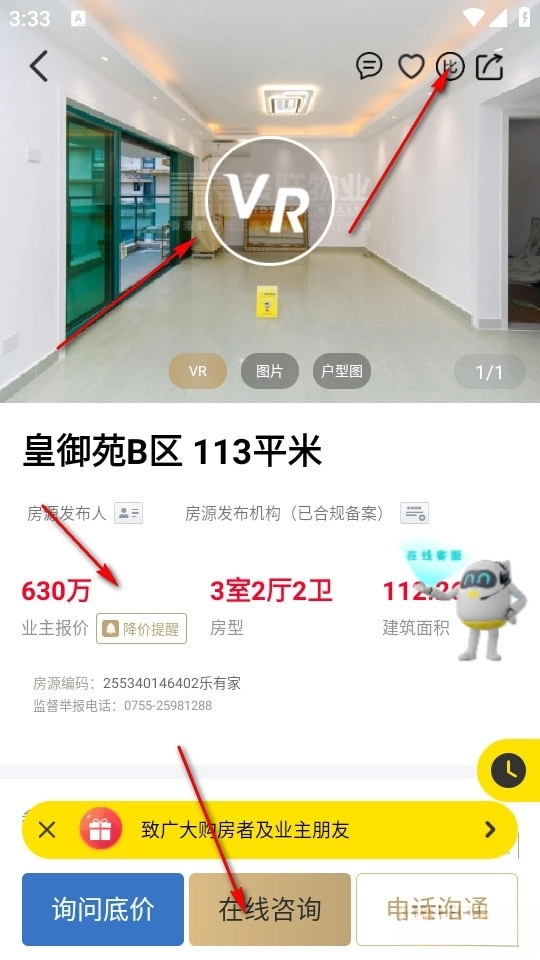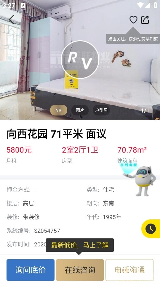 我们进入详情页以后我们可以选择利用VR视角看房,能够在右上角对同类型房屋进行比价,合适以后我们就可以在下方进行询价沟通了。