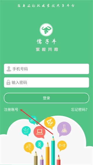 1、在孺子牛家校共育平台的登录页,点击“注册账号”按钮可进入注册流程,该平台用于家校协同教育,支持手机号+密码登录。