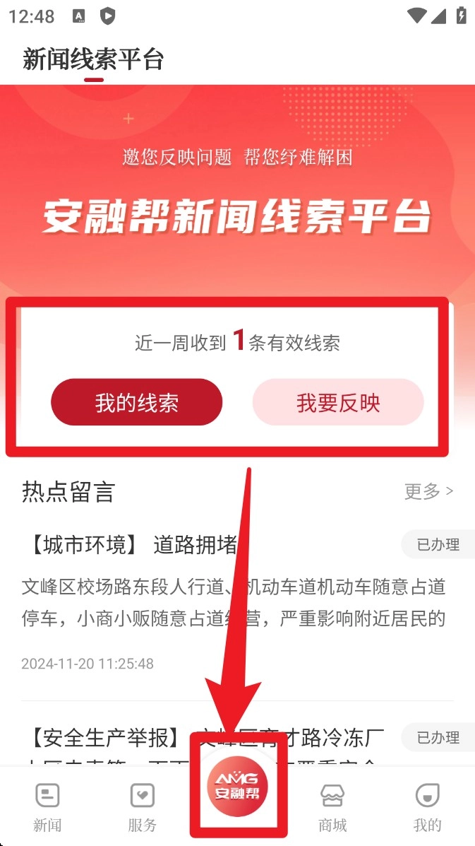 3. 点击底部正中间的安融帮图标,既可以选择“我要反映”来提交问题,也能点击“我的线索”查看反馈进度。