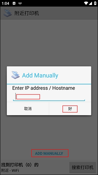5、进入【搜寻附近打印机】页面,点击【Add Manually】,输入打印机地址并确认,连接成功后即可直接发起打印。