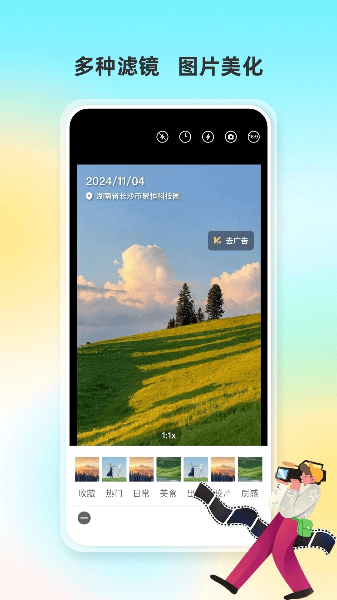 智能滤镜库:20+专业滤镜(如复古、胶片、清新),并支持滤镜强度调节与叠加使用,用户可根据场景快速匹配风格,还能通过AI算法自动优化图片色彩与光影,一键提升画面质感。