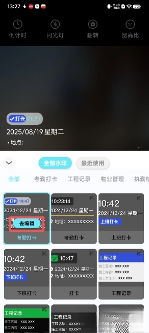 离线模式支持:核心功能(如拍摄、基础滤镜、水印添加)可在无网络环境下使用,适合户外作业、偏远地区等网络不稳定场景,确保工作不中断。