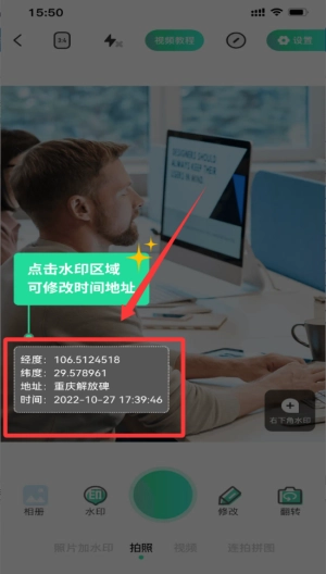 1、拍摄基础操作,进入拍摄界面后对准目标,轻触快门即可完成拍摄,系统自动添加当前水印。
