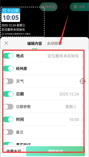 3、然后再点击编辑内容选择地点时间日期再点击右下角的保存水印。