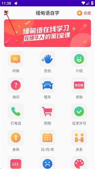 1、进入缅甸语自学后,点击左上角的菜单按钮,可展开侧边栏菜单。