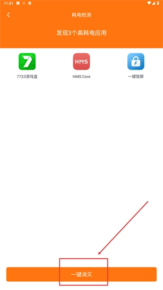 4、在【耗电检测】结果页,确认显示的高耗电应用后,点击【一键消灭】可关闭这些应用以降低耗电。