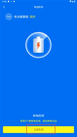 3、电池健康恢复完成后,在对应的界面中点击【立即检测】按钮,就能开启耗电检测功能,找出那些高耗电的应用,从而帮助优化设备的续航表现。