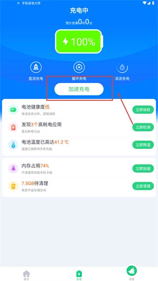 1、在充电界面,选择【加速充电】模式,同时可查看电池健康、高耗电应用等状态,按需操作对应的优化功能。