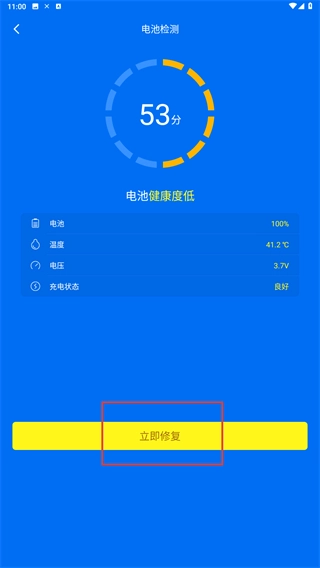 2、进入【电池检测】页面,查看电池健康度、温度、电压等数据后,点击【立即修复】可优化电池健康状态。