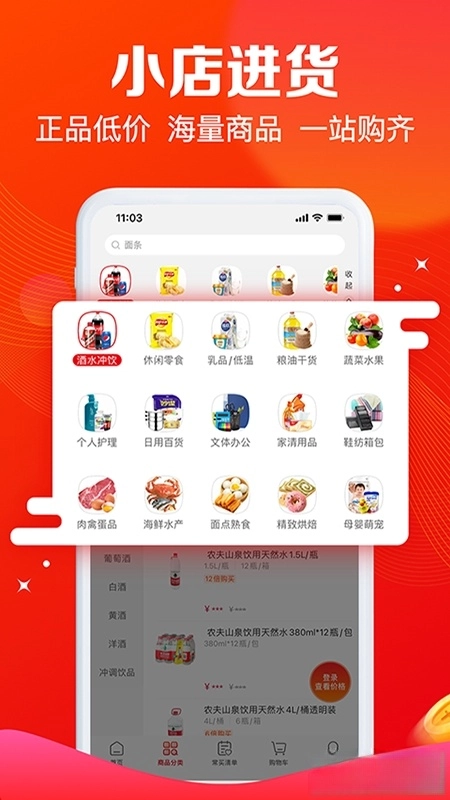 全品类商品覆盖:商品库涵盖食品饮料、日用百货、生鲜冻品、办公用品等12大类超10万SKU,支持按“餐饮专用”“便利店热销”等场景筛选,满足不同行业用户的差异化需求。