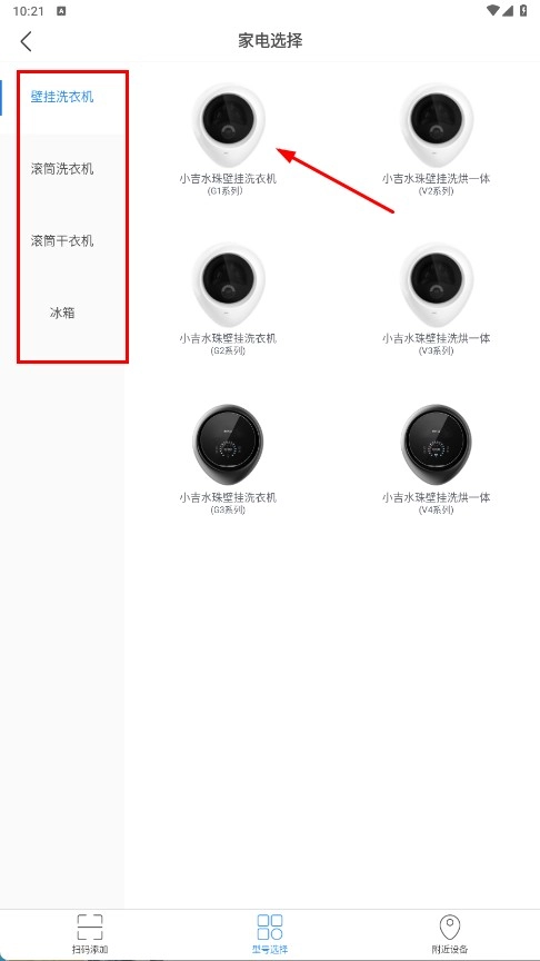 2、在左侧菜单栏中选择所需的家电类型,例如【壁挂洗衣机-分类选项】,接着从中挑选对应的具体型号。