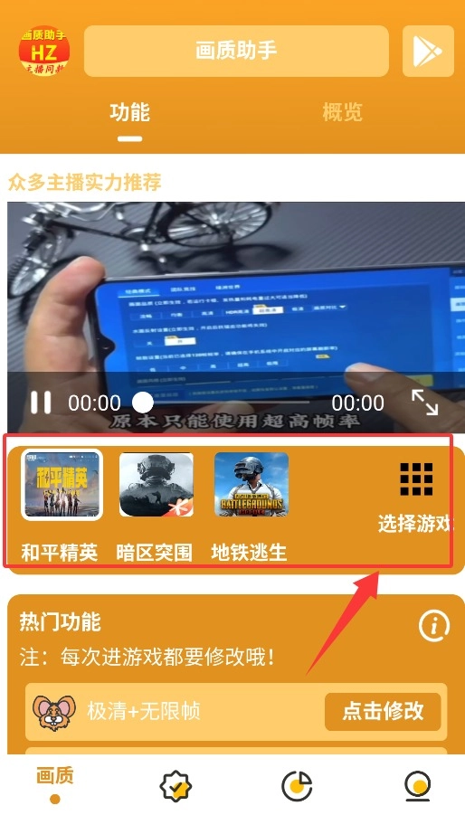 2、画质界面(或功能界面)提供游戏选择功能,可选取想要运行的游戏。