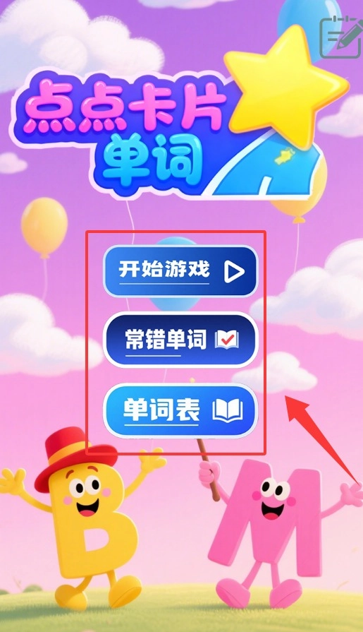 2、主界面提供"开始游戏"、"常错单词"、"单词表"三个主要功能入口。