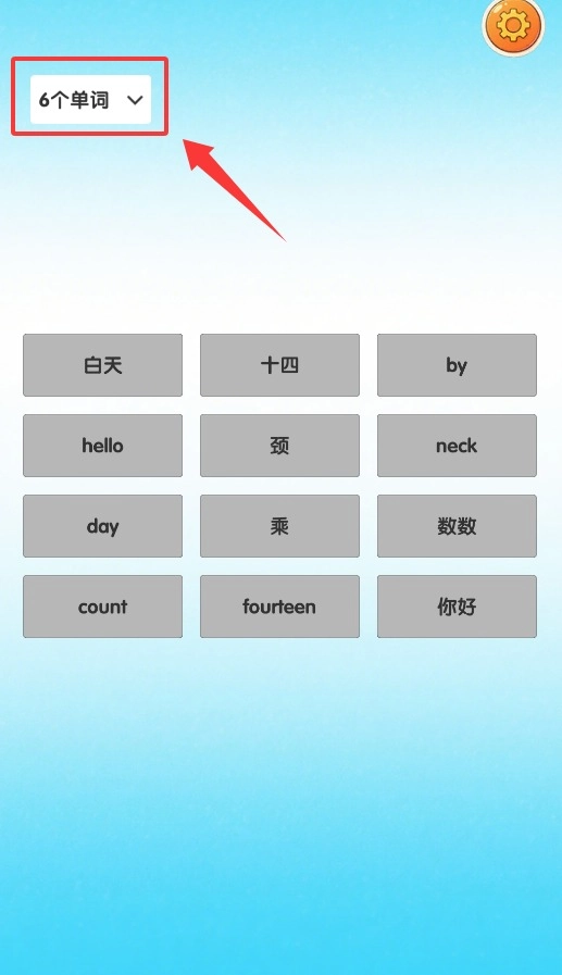 3、游戏开始前可在左上角选择单词数量,游戏模式为中英单词配对(如记忆匹配或连线题)。