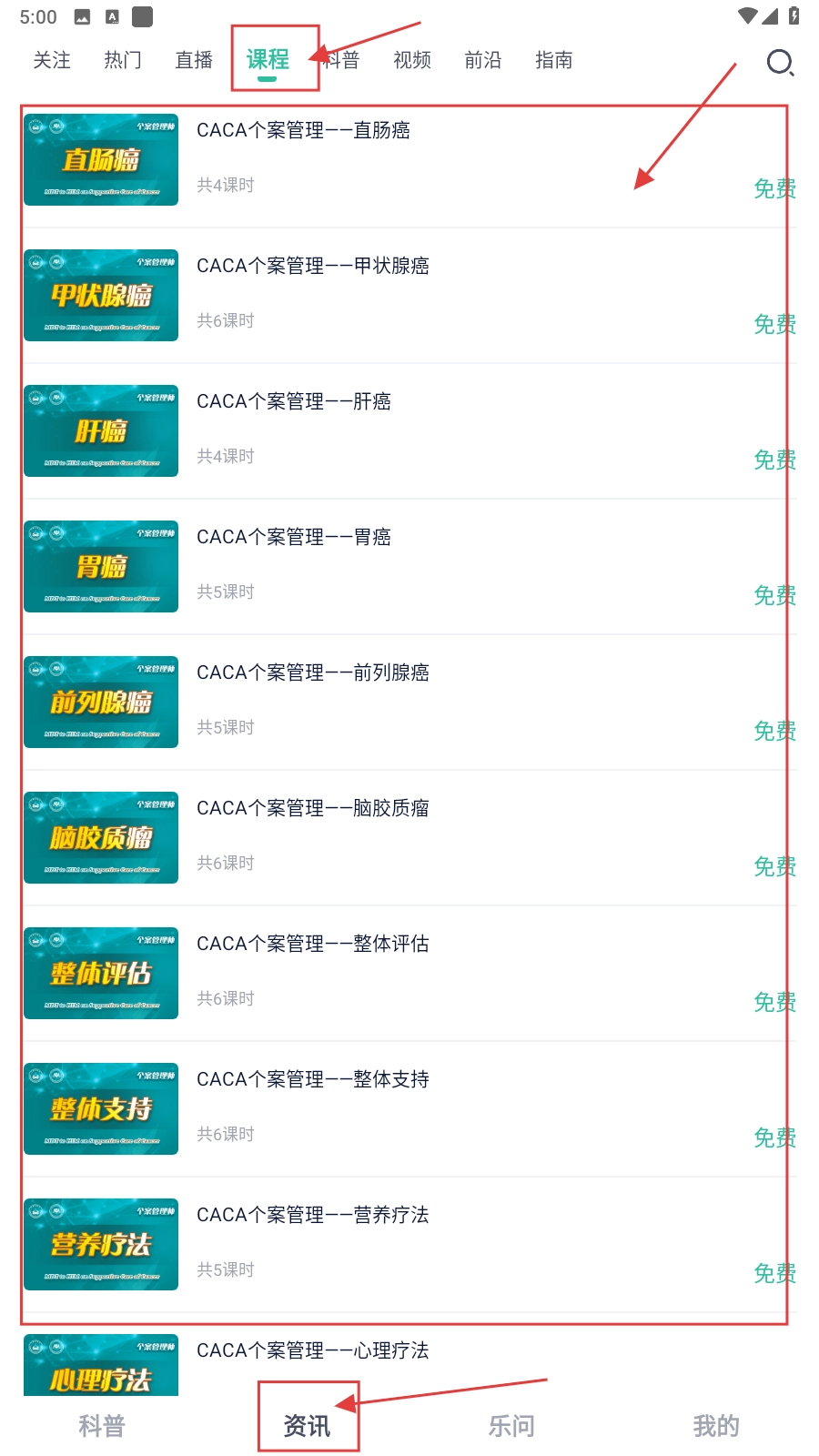 3、在【资讯】板块的“课程”分类中,可选择如“CACA个案管理——直肠癌”等免费课程,学习专业医疗知识。
