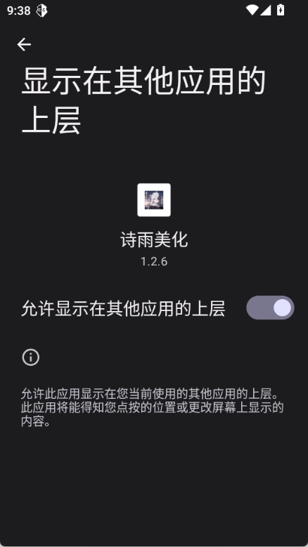 3、然后将诗雨美化插件显示在其他应用上层开关打开