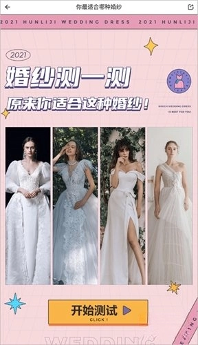 2、接下来我们点击“开始测试”,挑选出最满意的手捧花、首饰和婚礼场地后,就可以查看结果了,页面下方会依据你的选择推荐适合你的婚纱。