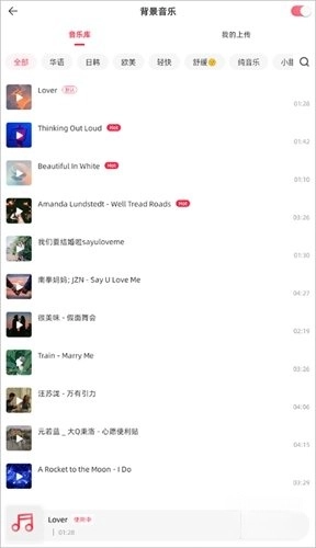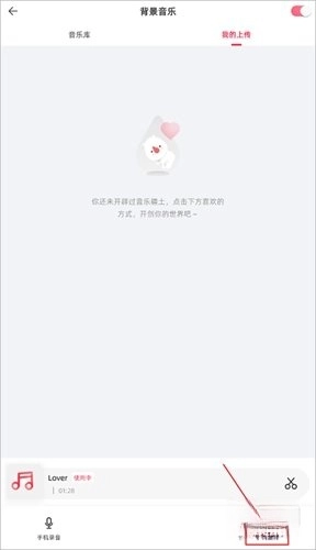 3、在背景音乐界面点击“我的上传”可点击下方的“手机上传”即可导入自己喜欢的音乐。