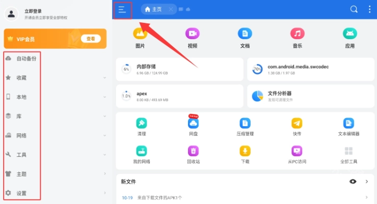 4、通过侧边栏可展开完整功能面板,包括自动备份、收藏夹及网络磁盘等模块。