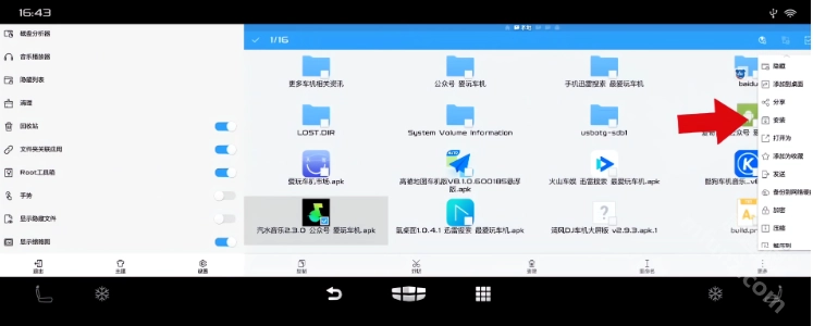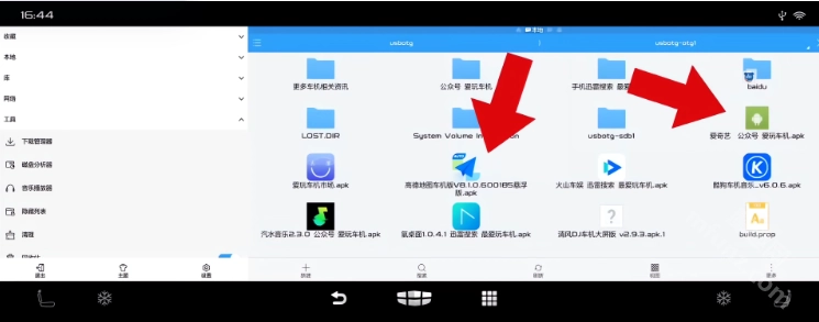 答:U 盘插车机,打开软件找到 U 盘路径,长按安装包选择安装即可。