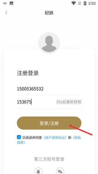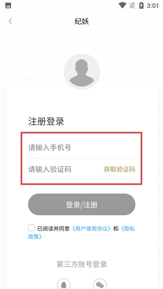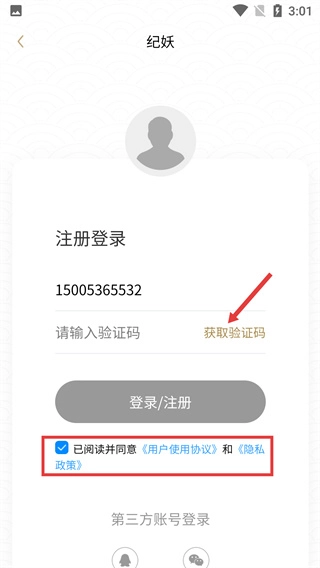 3、在【纪妖】的注册登录流程中,填好手机号后,要勾选【已阅读并同意-用户使用协议-和-隐私政策】,再点击【获取验证码】按钮。