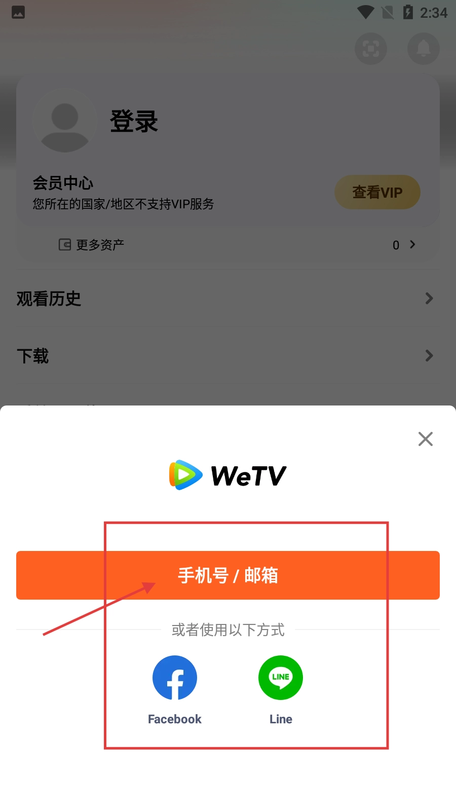 3、弹出登录选项后,你可以选择【手机号/邮箱】,也可以通过【Facebook】或【Line】来登录。