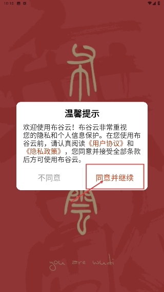 1、在布谷云的温馨提示弹窗内,阅读《用户协议》与《隐私政策》后,点击【同意并继续】按钮,以进入后续操作流程。