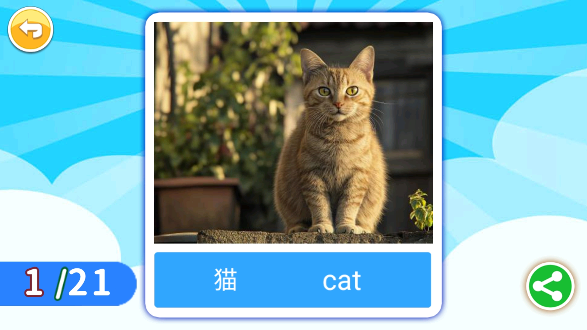 4、进入动物词汇学习页面,查看动物的中英文对照内容(例如【猫-cat】),并完成词汇学习的相关操作。