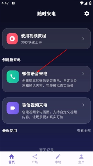 2、在首页找到微信语音来电选项并点击,即可进入语音来电的创建操作页面。