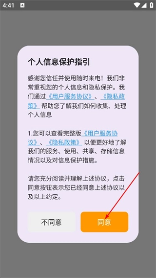 1、阅读用户服务协议和隐私政策后,点击同意,进入随时来电的首页。