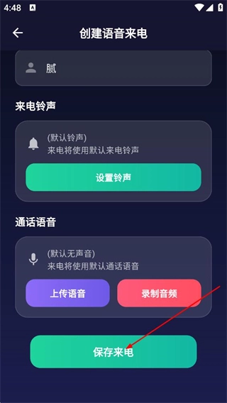 3、在创建语音来电页面,设置好内容后,点击保存来电,完成语音来电的创建。