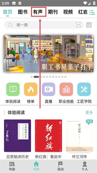1、进入首页,点击顶部【有声】选项,可进入有声内容分类页面,浏览各类音频相关内容。