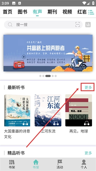 2、在【有声】页面,找到【最新听书】板块,点击右侧【更多】按钮,可查看更多最新听书内容列表。
