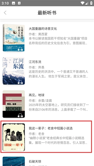 3、进入【最新听书】列表页,可看到《我这一辈子:老舍中短篇小说选》等内容,点击目标内容进入详情页。