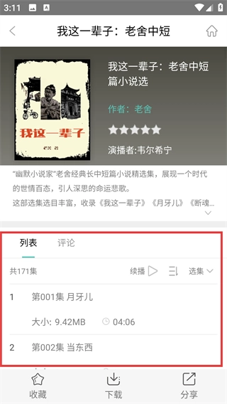 4、进入《我这一辈子:老舍中短篇小说选》详情页,可查看集数列表,点击对应集数即可开始收听该音频内容。