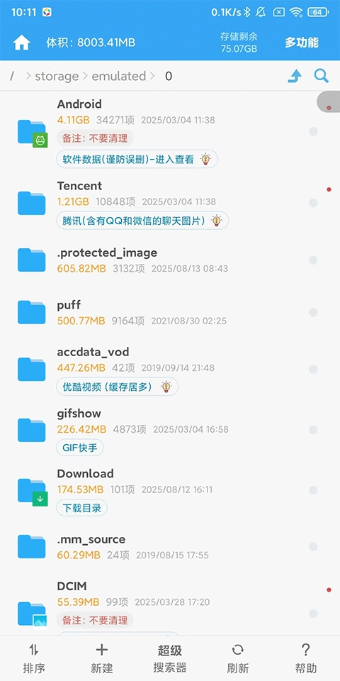 所以,在深度清理前,首先要把重要的文件备注为“不要清理”,来防止误删。软件初始默认备注了DCIM(照片)、Android(软件数据)这两个目录,就是为了防止误删。